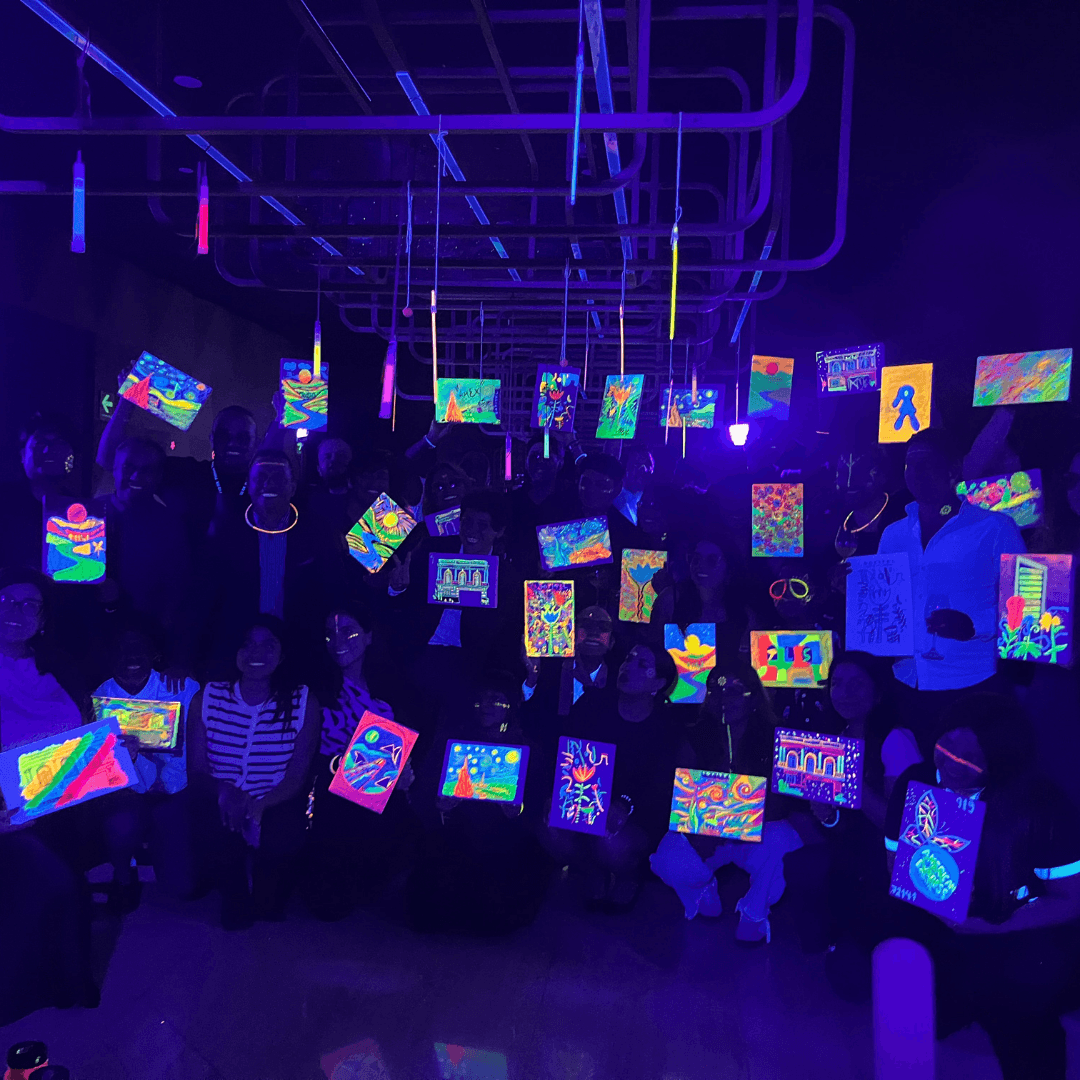 Ofrecemos pintura con luz neón, una experiencia divertida y original ideal para eventos corporativos, team building, cumpleaños y convivencias.
